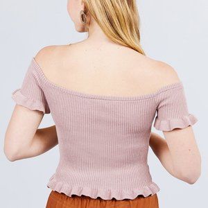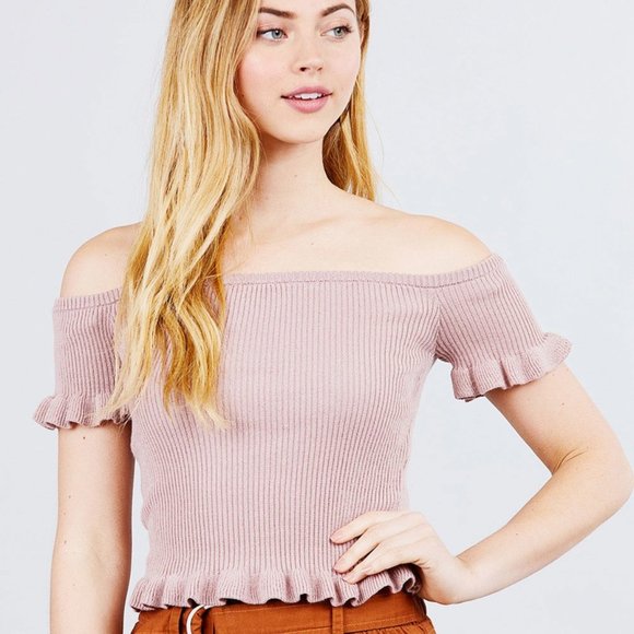 -SHORT SLEEVE OFF THE SHOULDER w/RUFFLE DETAIL SWEATER TOP-