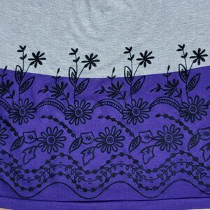 - Floral print in the purple section (growing into the grey section) on the front only
