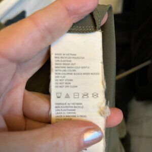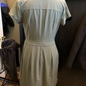 This adorable dress has some stretchiness to it. It is so cute, and I loved it so much, but sadly, I gained weight. I wish I could wear this dress forever. Snap front, cool collar, short sleeves, flattering fit. Neutral army green color goes with anything. Good to great used condition.