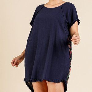 -Short Sleeve Round Neck Dress with Floral Print Back and High Low Scoop Ruffle Hem-