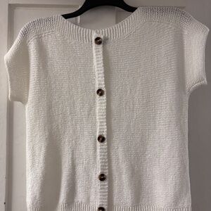 White, short sleeve sweater with button detail on the back of the sweater. Buttons are not functional.