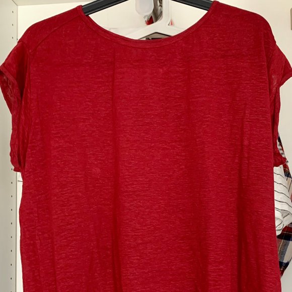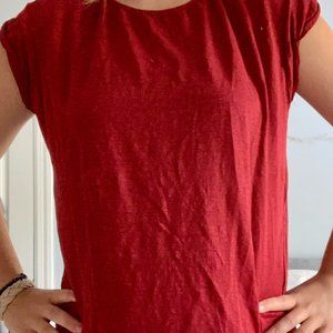 Red short sleeve t-shirt. It's a really thin and light material, but not see through at all.