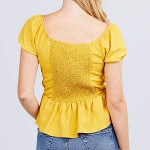 -SHORT SLEEVE HEART NECK w/BUTTON BACK SMOCKING DETAIL FLARE HEM WOVEN TOP-