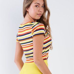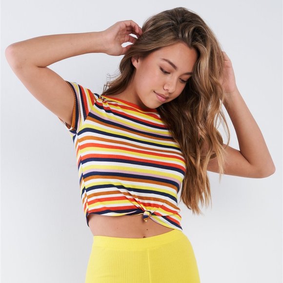 -retro, chic, stripes, blue white red purple yellow red and brown stripes, ribbed, scoop neck, unlined, stretchy-