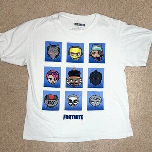 Front of shirt has 9 faces of Fortnite characters
