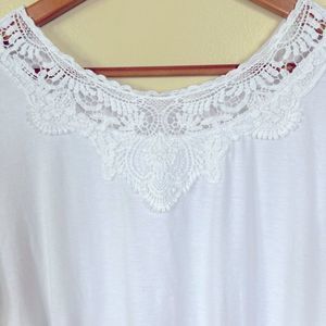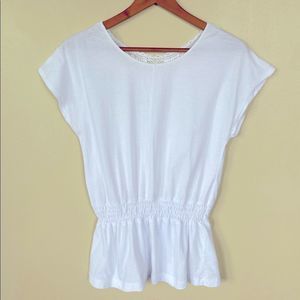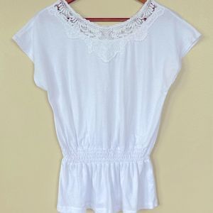 Cool and summery easy pullover top. Crochet detailing and a comfy stretchy waist. Too cute over a peasant skirt, shorts or jeans.