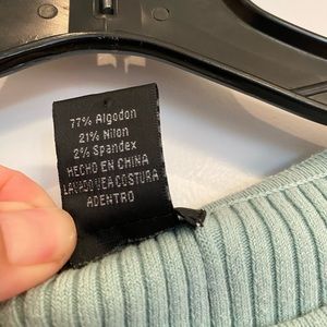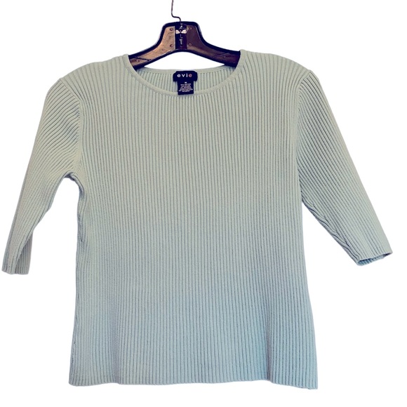 This light blue short sleeved ribbed sweater has a relaxed fit. Not too heavy for summer. Measured flat the shoulders are 15 inches, chest 17, waste 15 and bottom 16. The back to the bottom is 19 inches front to the bottom is 17 and the sleeves are 7 inches.