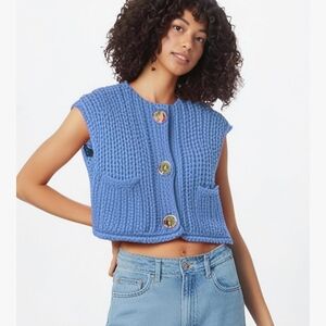 Stylish blue knit vest featuring gold buttons. Perfect for layering.