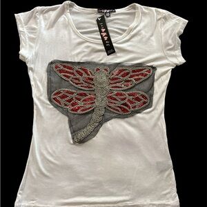 Short Sleeves Ivory S/M T Shirt With Sequins Butterfly Applique BNWT