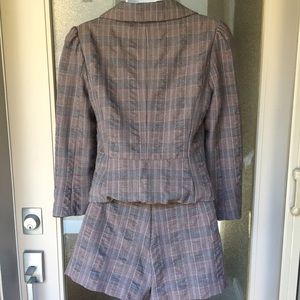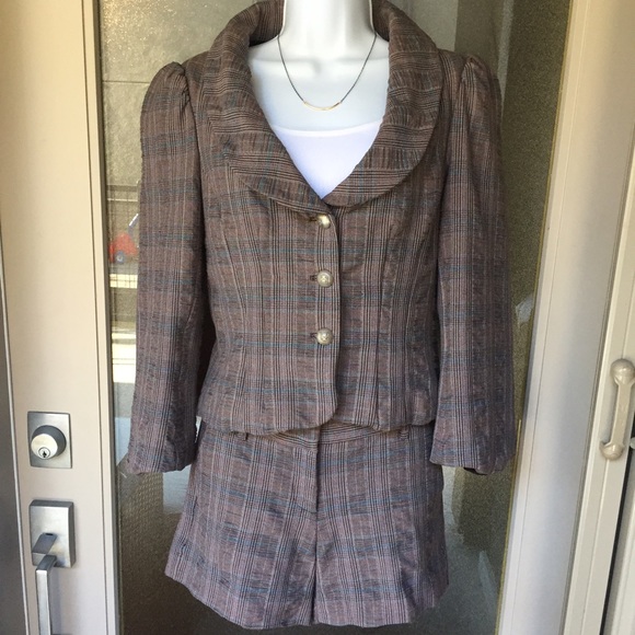 Feminine Short Suit. Multi color pattern suit. 65% Polyester 33% Rayon 2% Spandex. Jacket is lined. Shorts are not lined.