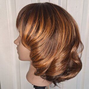 Short Wavy Synthetic Blossom Wig Daily Highlights Bangs Curly Light Dark Brown