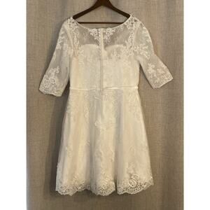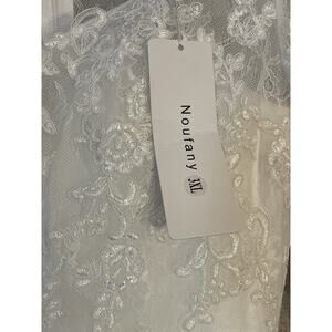 This short wedding dress by Noufany is a beautiful choice for women in size 3XL. It features a V-neckline, short sleeves with lace appliques, and a cream color. The back closure includes hooks, eyes, buttons, corset, and zipper for a secure fit. Made from lace material, this tea dress style gown is perfect for a formal occasion such as a wedding, with a built-in bra for added comfort. *new with tags but has been in storage for a while-could use a steam/clean.