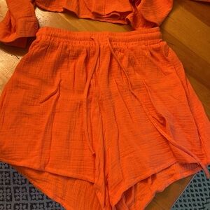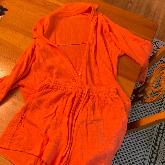 Gauzy material. BRIGHT Highlighter orange l. Pictures don’t do it justice. Purchased on Amazon. Wore once for a bachelorette.