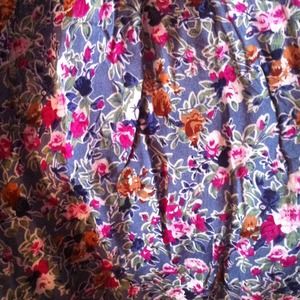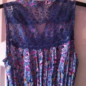 Blue floral dress from Mine. Size Small. Buttons at the top with a see through lace backing. Super cute for summer! Mid thigh length!