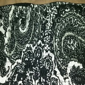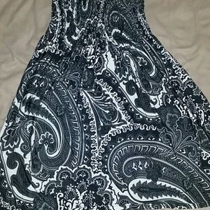 Strapless with elastic along the upper portion to keep it up. Black and white with a pale design. Says large but fits more like a medium. Very soft, silky and flowy material.