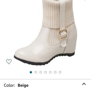 Selling a pair of short boots bought from Amazon that are new without tags. they were in an Amazon returns box I purchased. Ivory in color, flat heel. no side zipper. Size 42, which I would say is a 9. No scuffs at all.