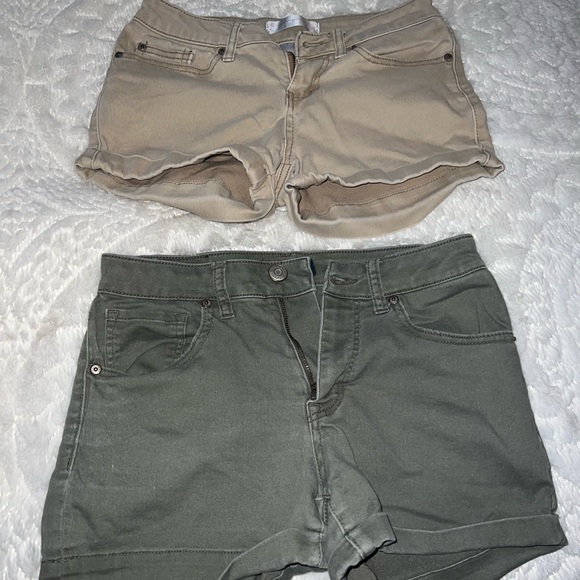 Two pairs of shorts. One pair is aeropastal shirt in olive green. The other is beige no boundaries. One is a size 9 but they fit very small.