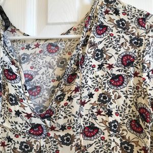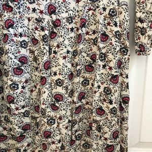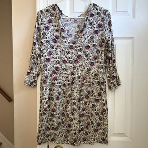Short dress, long sleeve. Floral print. V neck with laces. Button on sleeve .