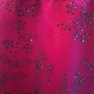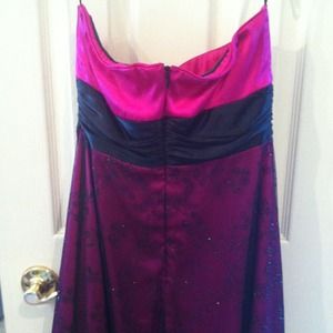 Fuchsia short formal dress from Dillard's! This dress is strapless with a black satin sash around waist! The bottom is a bubble skirt and the Fuchsia is covered in a black, glitter floral overlay. This is a size 5/6 and was never hemmed.