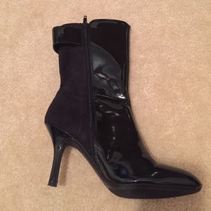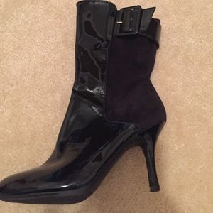 Shiny on front and velvet like material on back. Zip up on inside. 2.5/3 inch heel. Barely worn. Mid calf height.