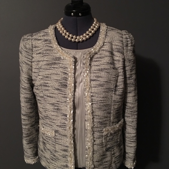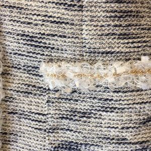 Off white and blue short jacket, lined. 3/4 arm, has very little gold accents in fabric. Runs small, more like medium