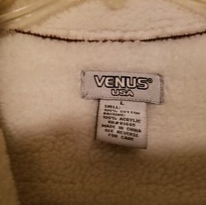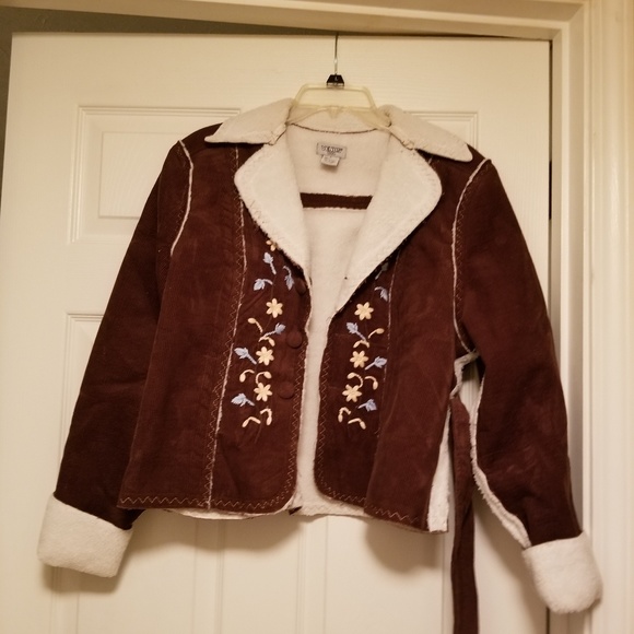 Brown and cream colored short jacket. Fits more like a medium than large.