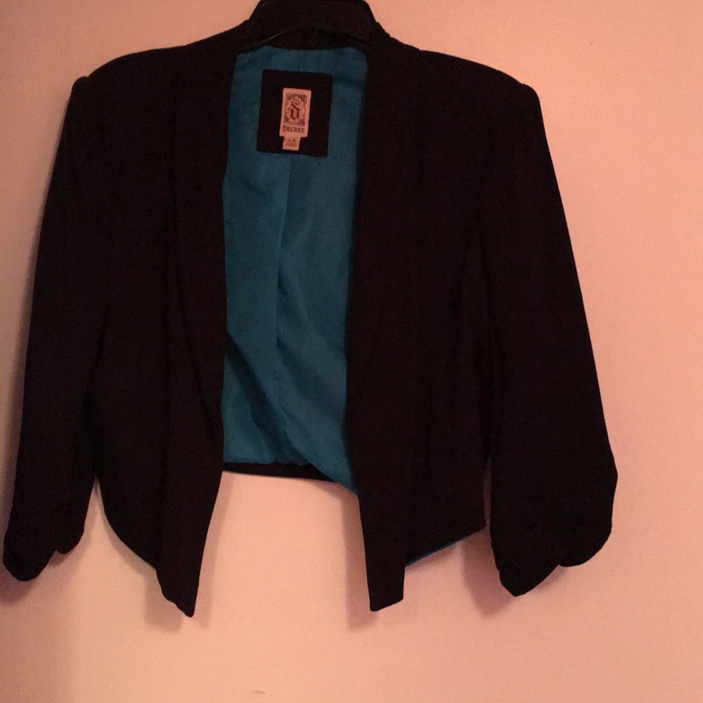 Short black jacket made of rayon with turquoise lining. End of sleeves are bunched. Says large but fits medium