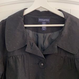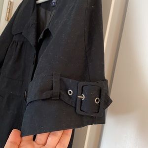 Black womens short jacket, super cute style with buckets on the sleeves, real button and real pockets. It has never been worn! Doesn’t have tags though. It has lint on it in the pictures