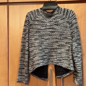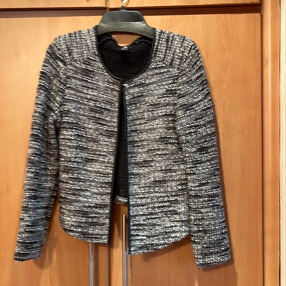 Trendy short jacket that goes with jeans, pants or skirt, multi colored in gray hue with silver thread, size medium