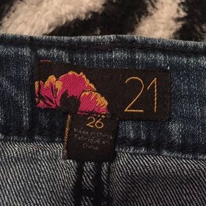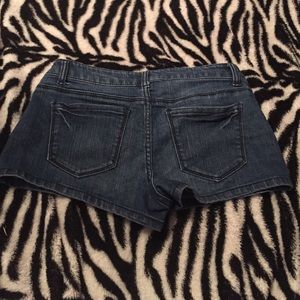 Short Jean shorts. They are on the shorter side and have a darkish wash with very slight distress on the left side. Worn once