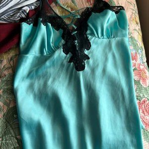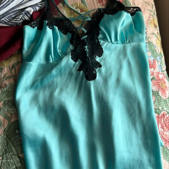 Short night gown with adjustable straps, crisscross straps in back. Gown has black lace trim machine wash and made in China.