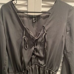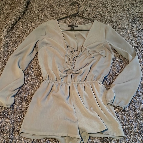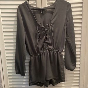 Long sleeve, short, lace up one piece. Bottom below elastic is lined. Very cute and breezy!
