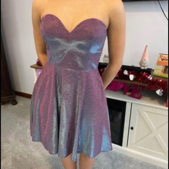 Iridescent purple juniors dress- size medium. Fit and flare. Strapless with a sweetheart neck. Above knee skirt.