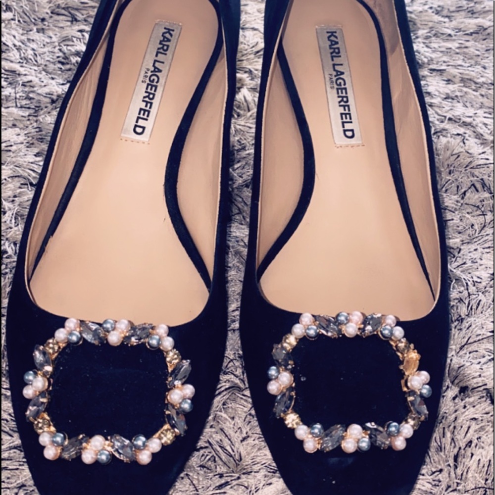 Karl Lagerfeld Paris short pump in suede and patent leather.2.5 .Open toe. It’s missing a little detail.
