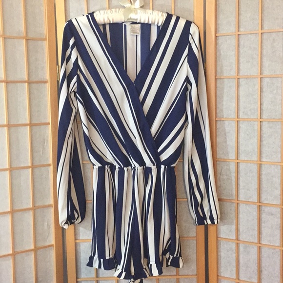 Long sleeve polyester shorts romper. Has I little snap in front you can leave open and where something under or snap shut. Super comfy and cute with heels or sandals. Great for hot weather wine tasting. Blue and cream stripes.