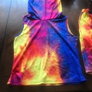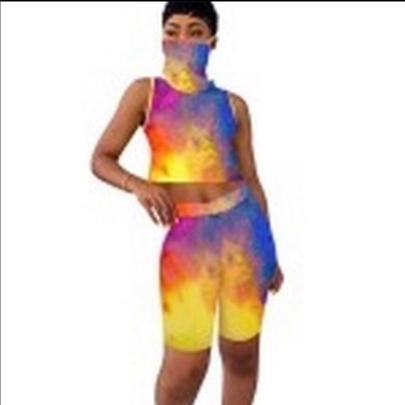New two-piece tie-dye shorts it built and facemask. Available in black, yellow and pink. Size small only.