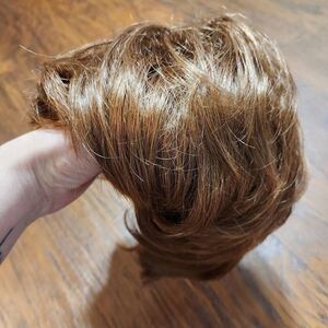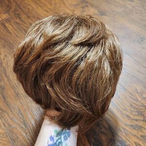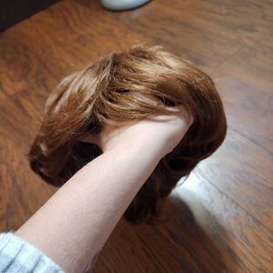 Short chestnut brown shag, layered wig with curtain bangs. Not real hair. See pics for inside of wig. Pre-owned, but in great condition. Only worn a couple of times.