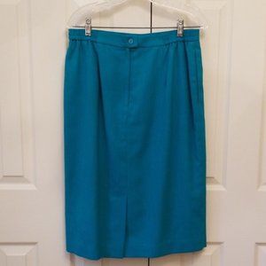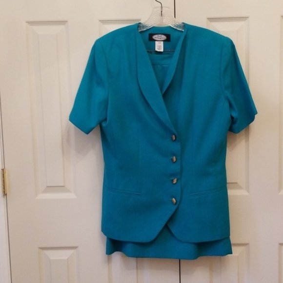 Kate Mcnaughton Turquoise short sleeve 2 piece suit with gold buttons. Short sleeve jacket with matching skirt. 100% polyester, dry clean only. The jacket has two functional pockets, the skirt as well has 2 functional pockets. **Please note the color is closest to the 3rd picture of the close up of the gold button, turquoise (I used the Poshmark app to take the pictures and in all the other pictures the color is a little off)