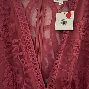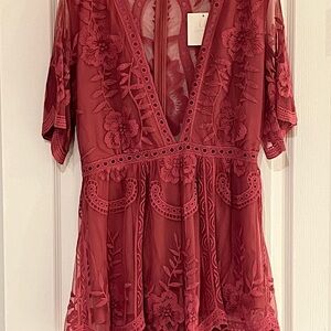 Brand new, never worn (tags still on). Size large raspberry romper with beautiful lace overlay. Zipper back