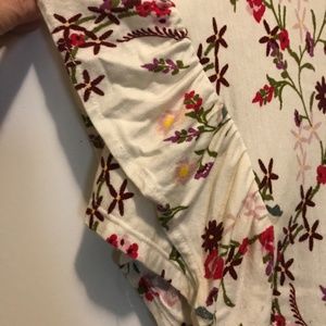 Off white top with ruffle short sleeves. Florals in yellow, purple, fuchsia, pink and red. Made of 95% Rayon and 5% spandex. Worn once. Size is large. Smoke free home