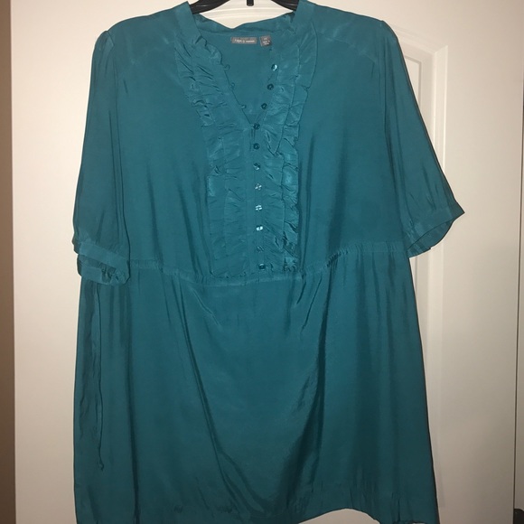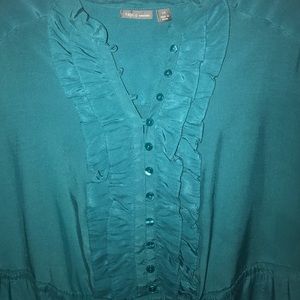 Super cute turquoise, ruffled front shirt that can be gathered at sides to give the best fit!