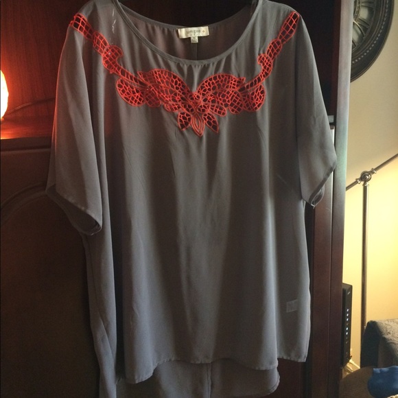 A beautiful top worn only once. Boutique brand, well made. Breezy, lightweight fabric. Orange embroidered cutouts in front of top make this a unique, flattering piece. Back of top features split near the bottom. Ships expediently from a clean, smoke-free home.