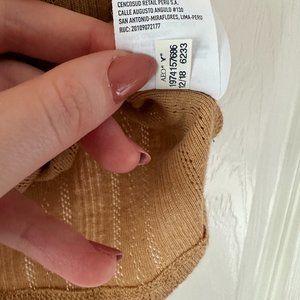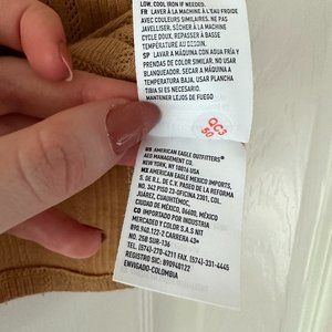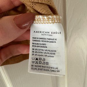 Pre-owned, in good condition. American Eagle t-shirt. This shirt has a knit pattern with lettuce edge sleeves. Care tags attached. Very very stretchy and comfortable! - faded caramel color. Great summer or fall color.