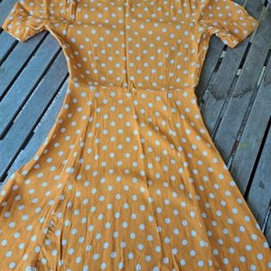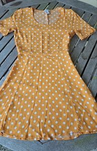 short sleeve summer dress. mustard yellow with white polka dots. side zipper. no flaws, rips Hand wash cold only. do not dry clean