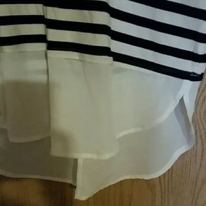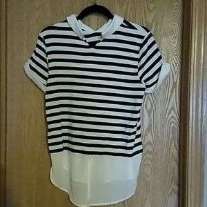Cotton on most of the shirt and silk at the bottom and on sleeve cuffs and color. Two buttons at the bottom of the shirt. Slit on the bottom of shirt in the back. Color has a button in back to close it