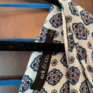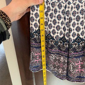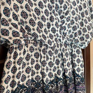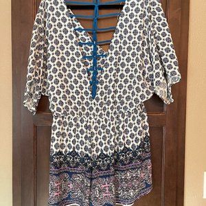 Super cute paisley design romper. No tags but it has never been work. Snap enclosure on the front chest. Measures a little over 12' from the cinched waist area. Pretty blue string back design.