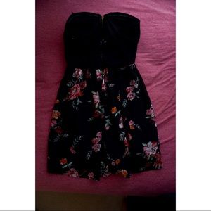 Lace patterned bust with a flowing floral bottom, gold zipper in front, about mid-thigh length. Strapless dress with inner rubber strip lining to stay secured without tape. Works for both casual and dressy wear!
