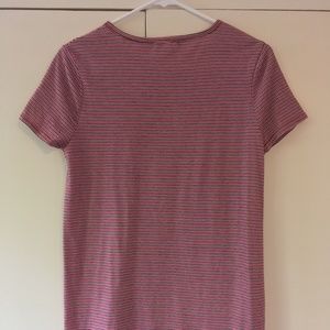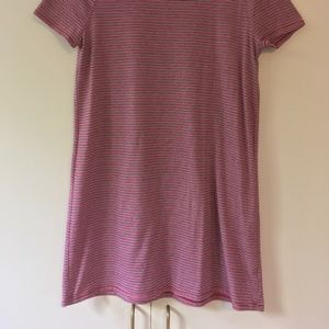 Short, stretchy cotton t-shirt dress. Thin striped red, white and blue. 28 inches from neckline to bottom of hem.