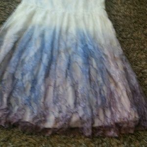 Thigh high dress, fades between white, blue, and purple with simple flower patterns, with a small back zipper