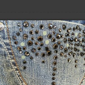 Some missing crystals, but has bag of replacements. Very short waisted. Long sleeves. Fits more like a medium. New never worn.